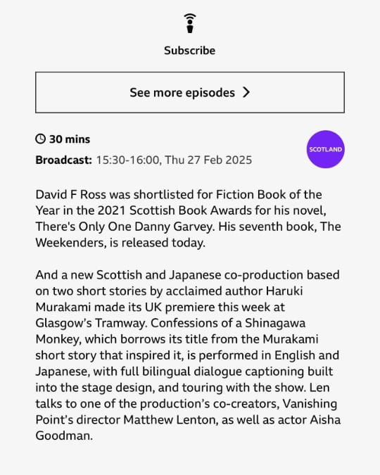 David will be talking to Len Pennie on The Arts Mix, BBC Scotland about The Weekenders.